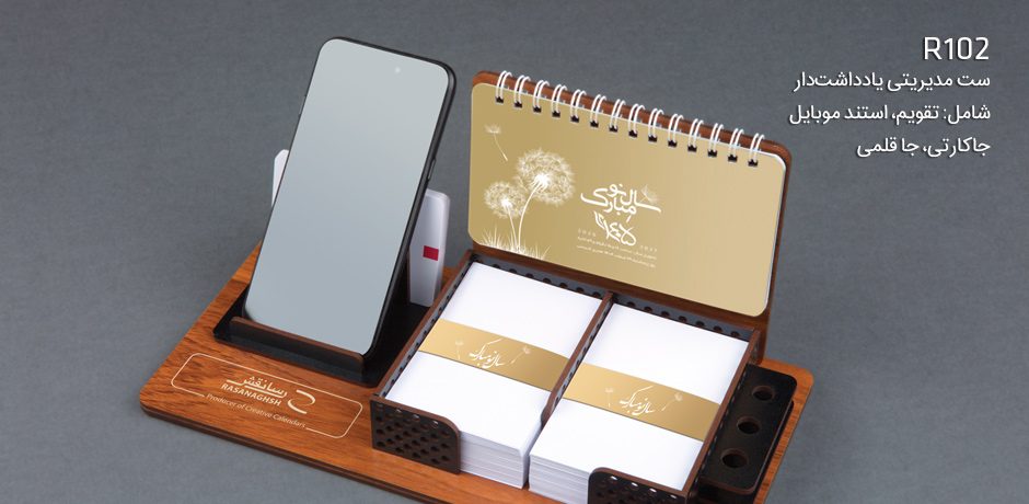 در طراحی تقویم رومیزی مدیریتی یادداشت دار ضمن دسترسی کاربر به تقویم رومیزی، امکان قرارگیری موبایل، کارت ویزیت و نوشت افزار نیز در فضایی مناسب تعبیه شده است.
