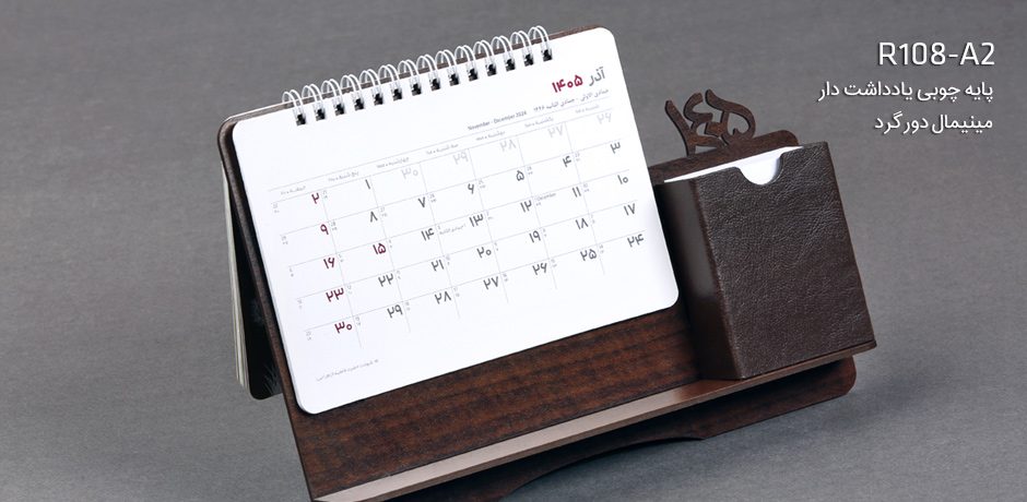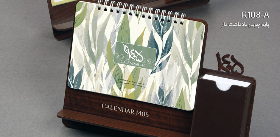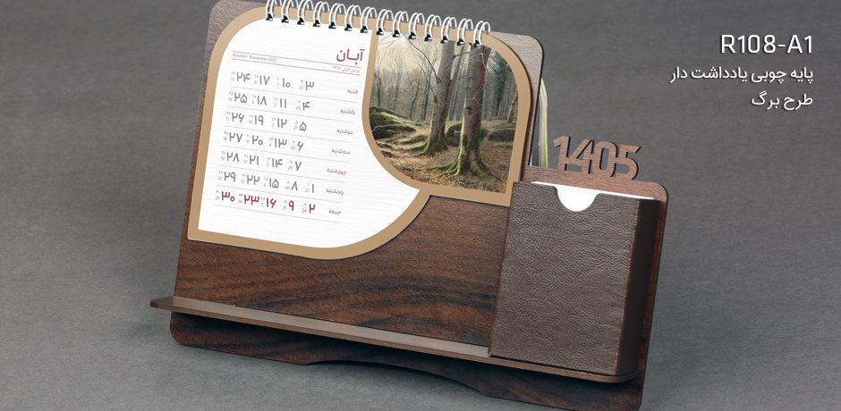 ترکیبی از بافت چوب و جا یادداشتی چرمی در طراحی تقویم رومیزی پایه چوبی یادداشت دار حسی از وقار و هارمونی را به مخاطب ارائه می نماید. علاوه بر این یادداشت کاربردی آن و فضای قابل استفاده زیر صفحات تقویم برای قرارگیری نوشت افزار کاربرد این تقویم رومیزی را دوچندان می کند. این تقویم در 2 مدل نقاشان جهان و مینیمال قابل نوشتن ارائه می گردد.